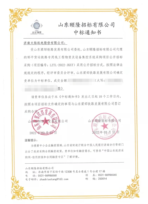 喜讯!济南大陆机电股份有限公司3月31日成功中标邹平货运铁路专用线工程物资及设备采购项目集控系统,中标金额近2900万元,在山东疫情日益严峻的形势下,大陆股份克服重重困难,实现了2022年第一季度的完美收关。